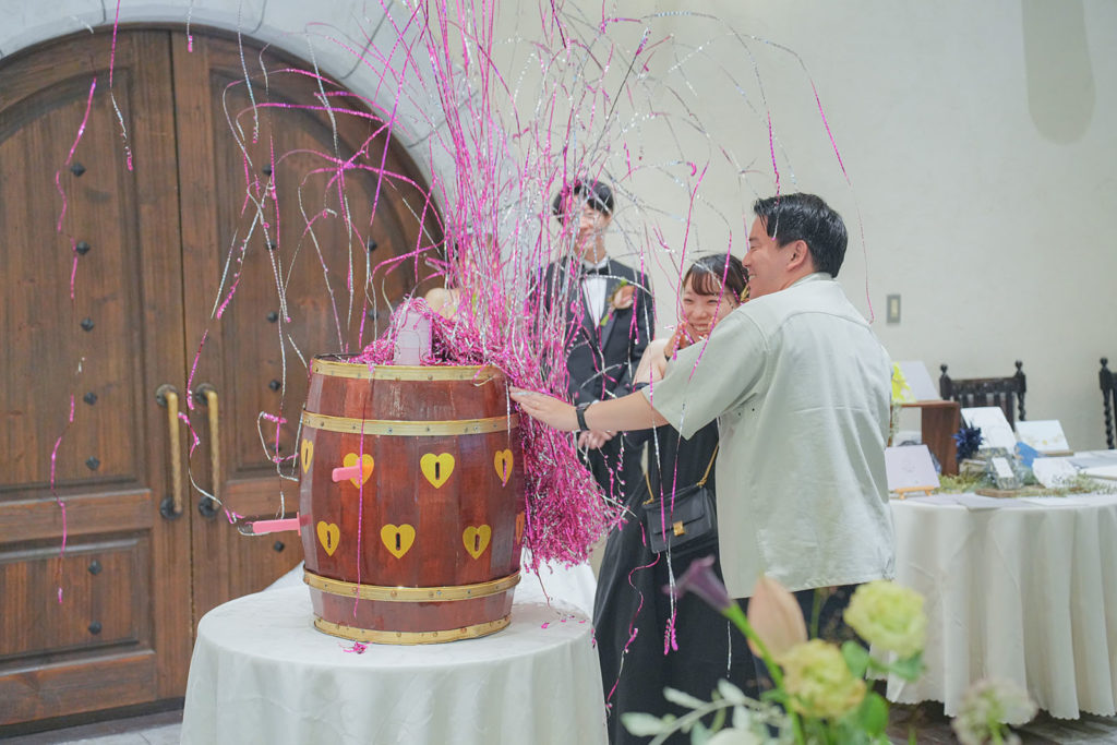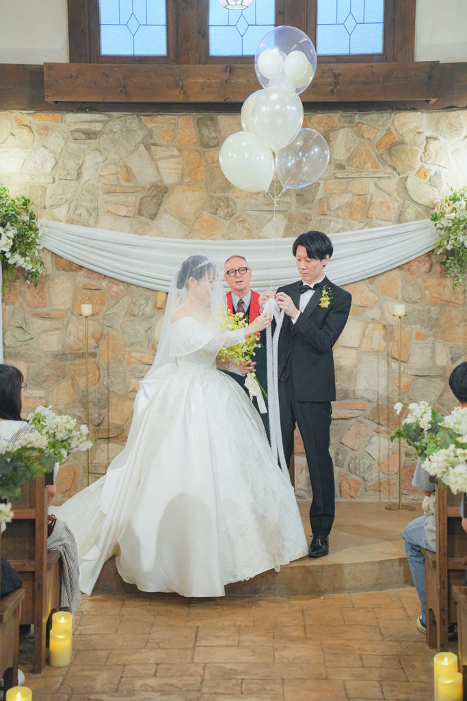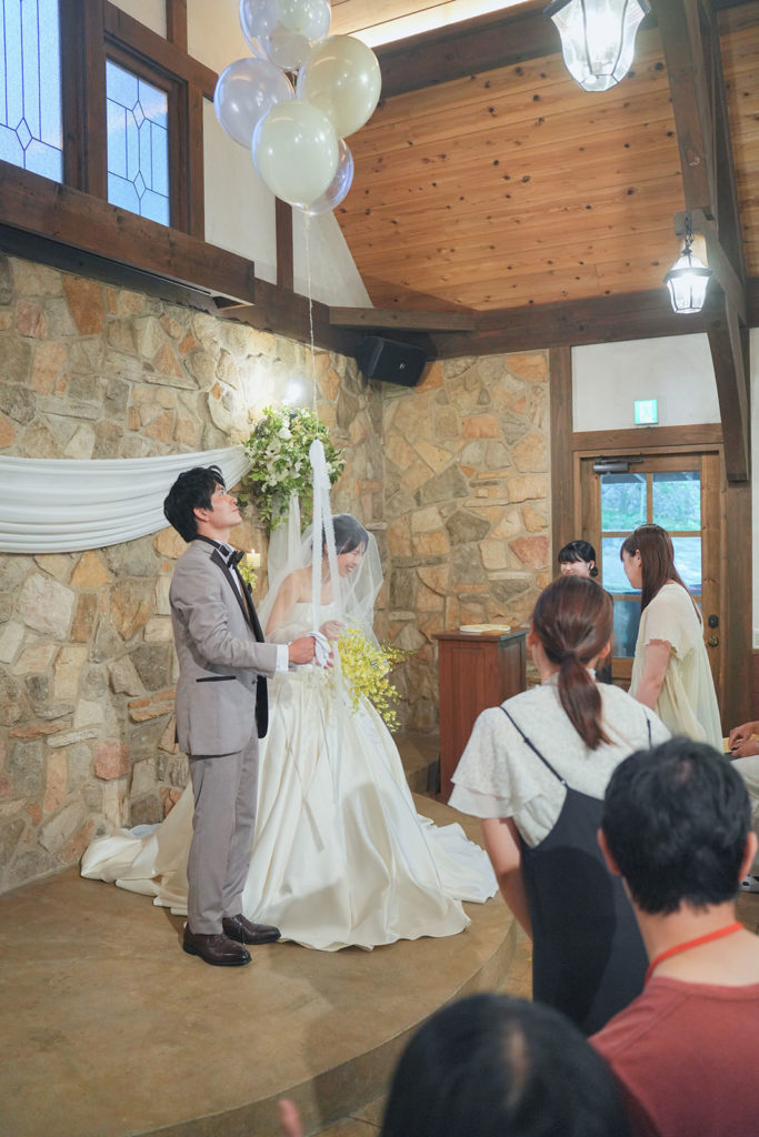 リングがふわふわと揺れるバルーンを目印に新郎新婦のもとへと届けられるリングリレー演出は、見た目にも華やかで、印象に残るひとときとなりました。