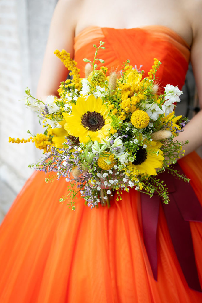 ひまわりブーケには、軽やかな素材のウェディングドレスがよく似合います。例えば、コットンレースのドレスや、シンプルなAライン、エンパイアラインのドレスがおすすめです。