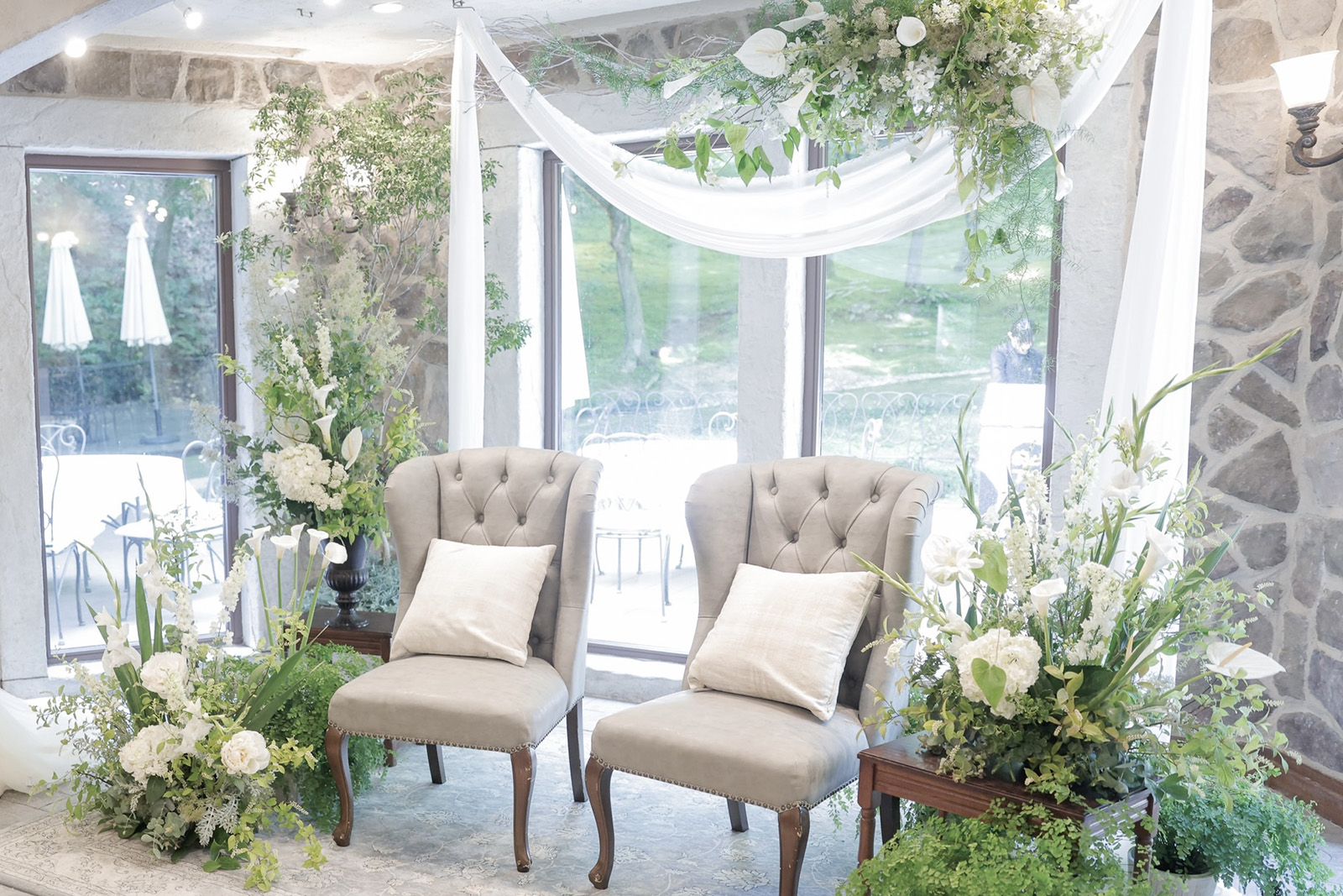 会場装飾は、グリーンを多めに使用し、キャンドルやガラスの器などを取り入れることで、ナチュラルでありながらも洗練された空間を演出できます。