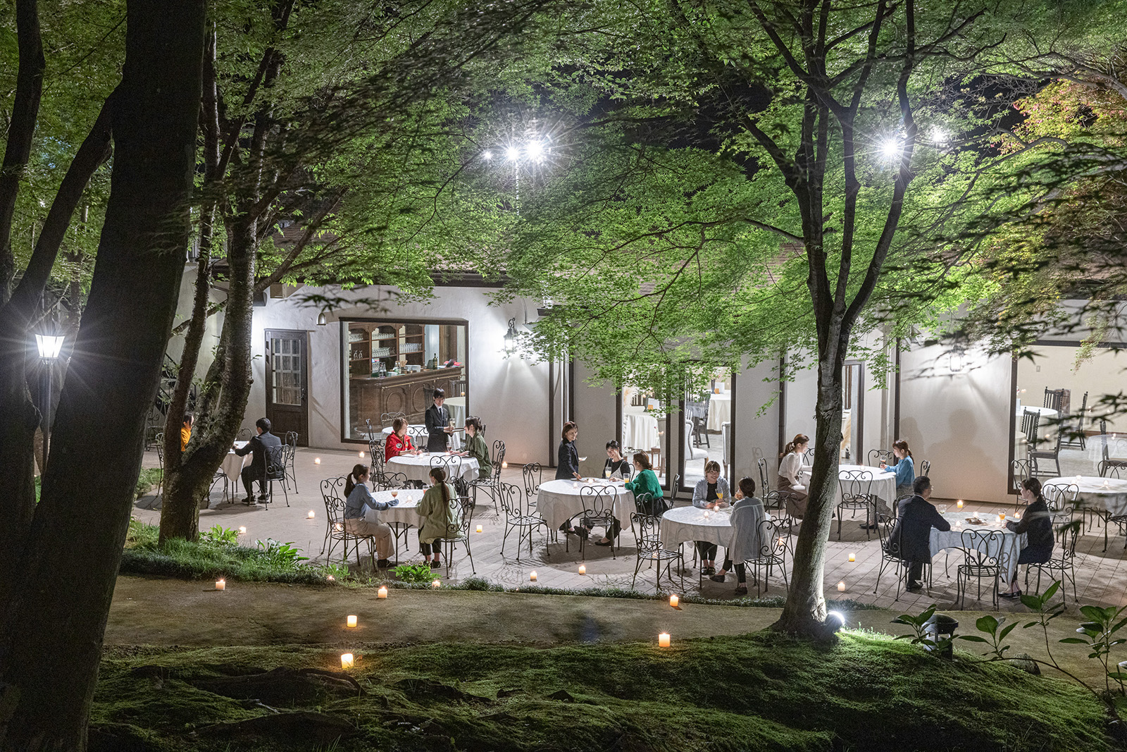 小鳥のさえずりや小川のせせらぎ、緑豊かな庭園に包まれながら味わうランチやディナーは、日常を忘れさせる贅沢なひととき。昼は木漏れ日が差し込むガーデンで爽やかに、夜は星空とライトアップに彩られた幻想的な空間で、心に残るひとときをお過ごしください。
