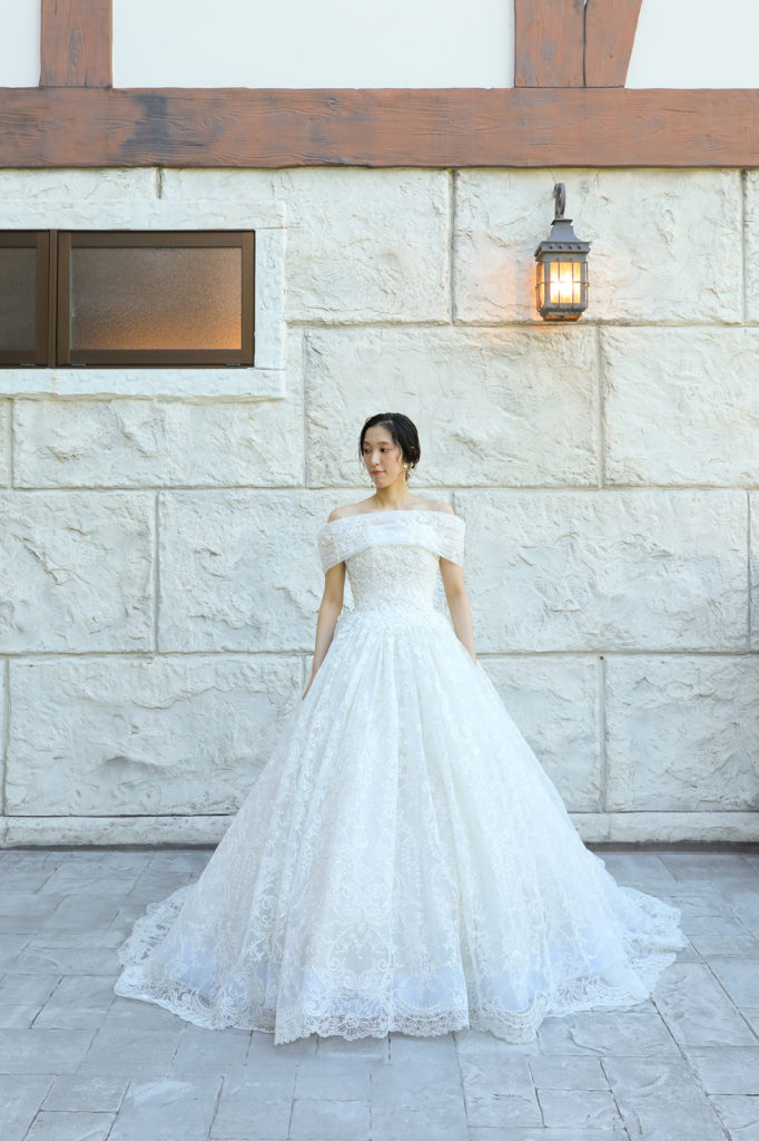 不動の人気を集めるオフショルダーのケープはちょうどいい透け感で、ドレープにレースを散りばめることで少しモダンなイメージも感じさせます。