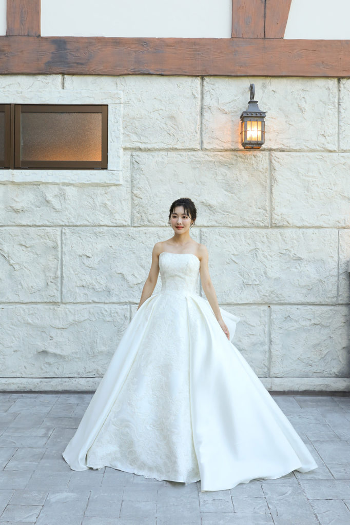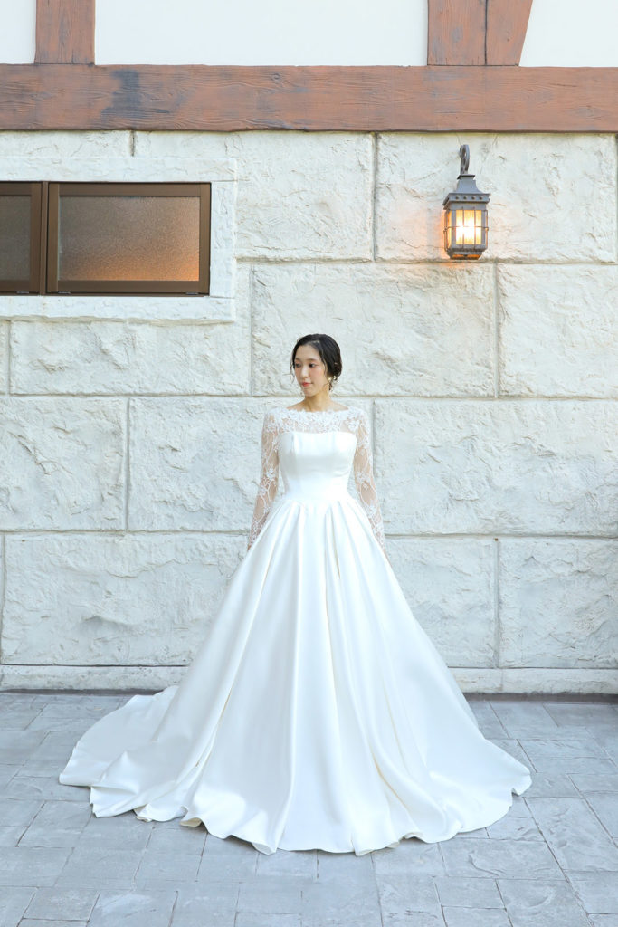 ミカド生地を使用したクラシックスタイルのドレス!ミカド生地の重厚感にも負けない繊細で存在感のあるレースが目を惹く1着です。