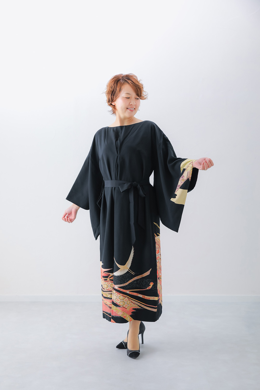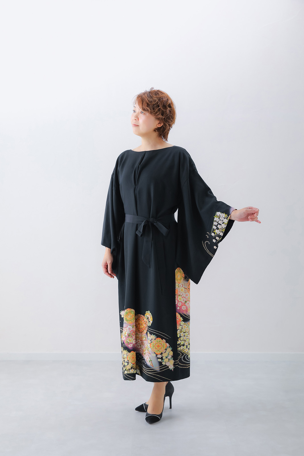 留袖ドレスは、黒留袖の柄行や格式を生かしながら、洋装に仕立てたフォーマルドレスです。