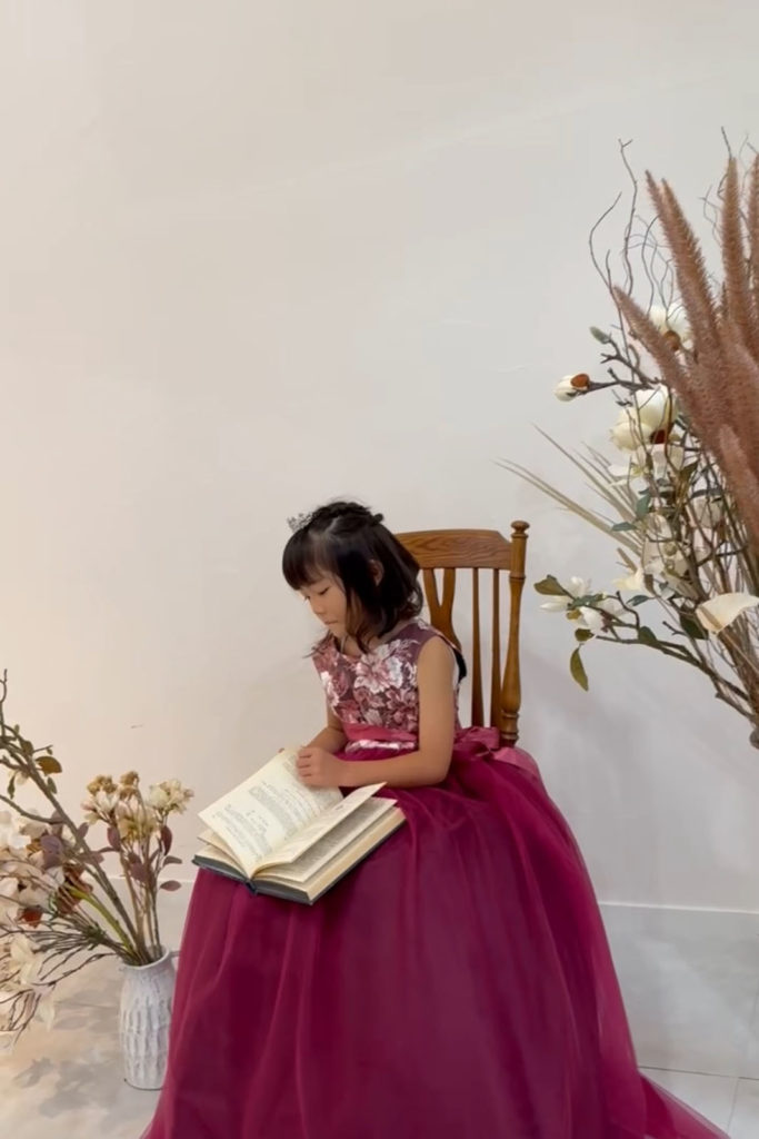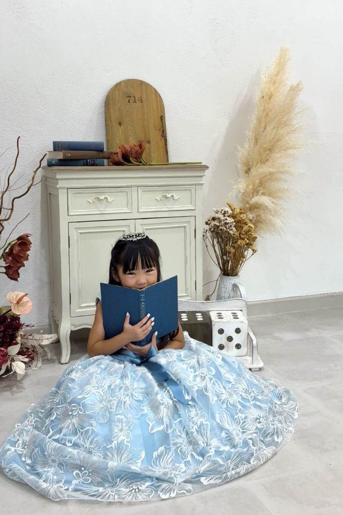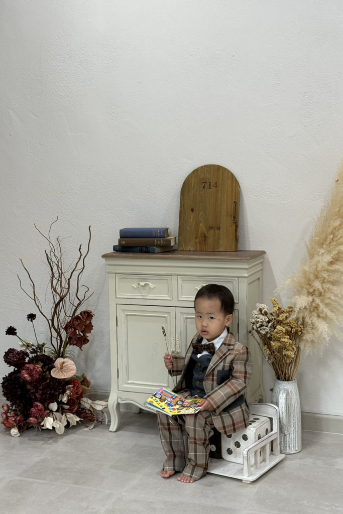 彩音のスタジオは白をベースとしたシンプルなスタジオですが、シンプルだからこそ小物が良く映えます。本やドライフラワー・バルーン等の小物を使用し、お子様の雰囲気にあった撮影が可能です。小物はお持ち込みいただくこともできるため、イメージに合ったお写真になるでしょう。