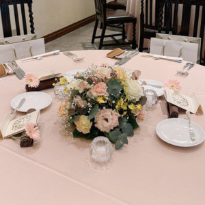 春婚礼にぴったりの優しい彩りのテーブル装花アレンジメント。間にピンクのスイートピーをお入れし、より暖かく、より心に残る空間になります。