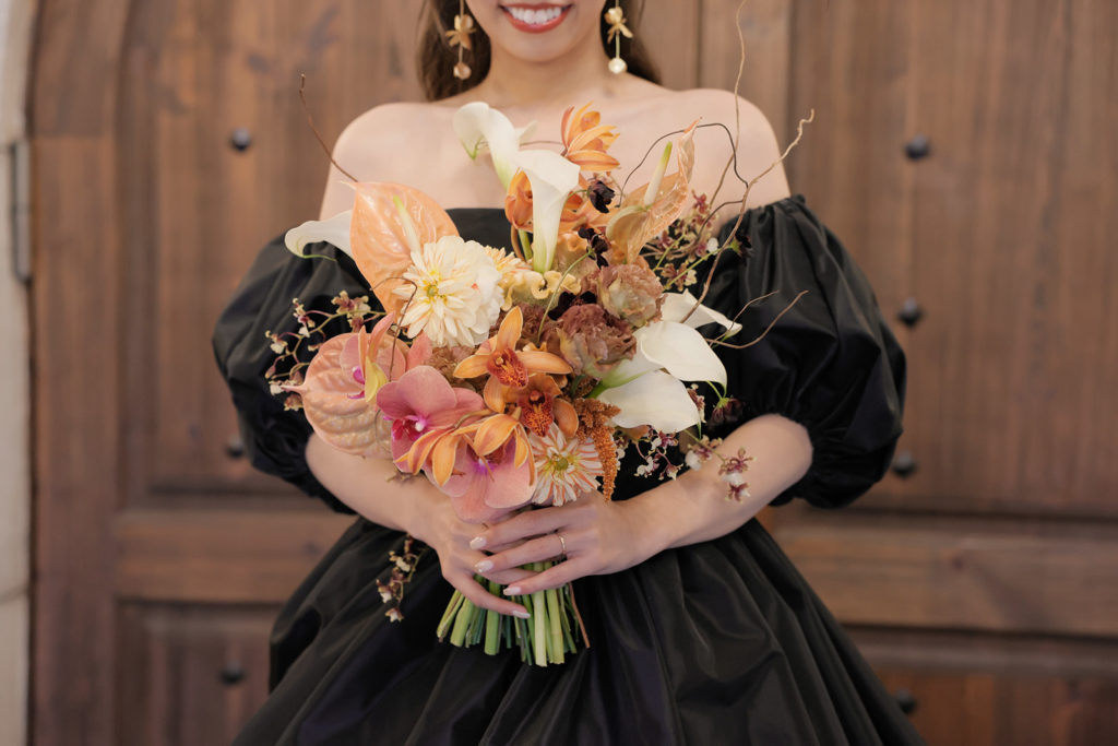 会場装花とのバランスだけでなく、ドレスとの色の相性も含めて整えることで、より統一感のあるコーディネートになります。