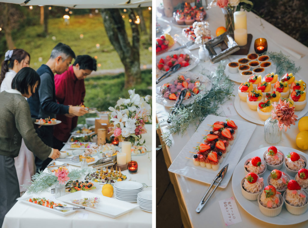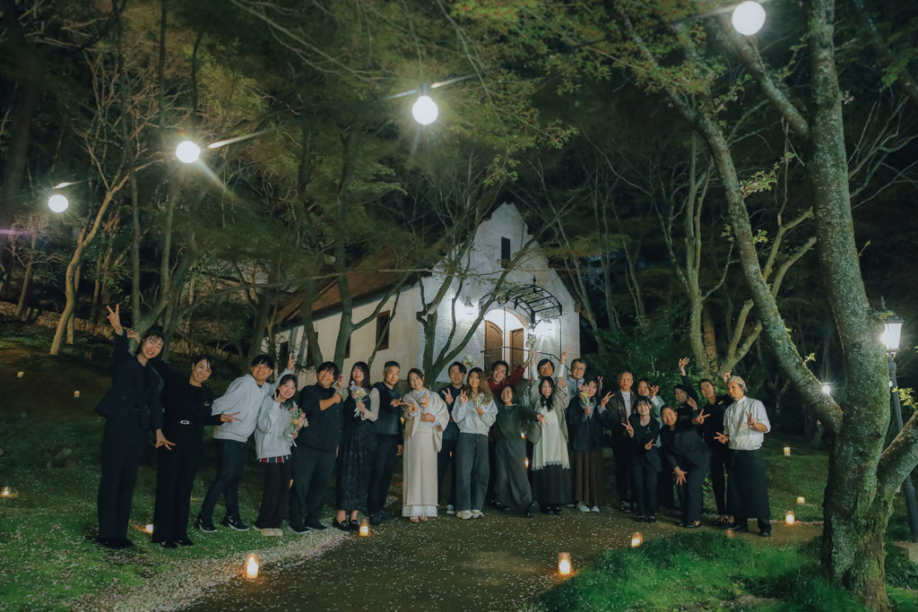 夜の空間を演出したのは、柔らかな電飾とキャンドルの灯りです。華美な装飾ではなく、自然な温もりが感じられるライティングを心がけました。